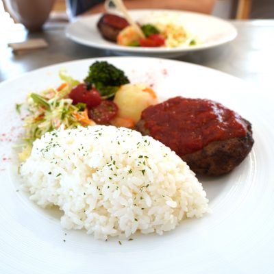 ビーフシチューや本日のパスタやピザなど悩みながらも“関谷牧場”ジャージー牛のハンバーグプレート〜サラダ・ドリンク付き〜をチョイス。