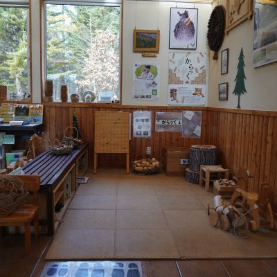 カラマツ材を使用した建物の中は手作りの展示物がいっぱい!お子さま用の小さな遊び場もあります。