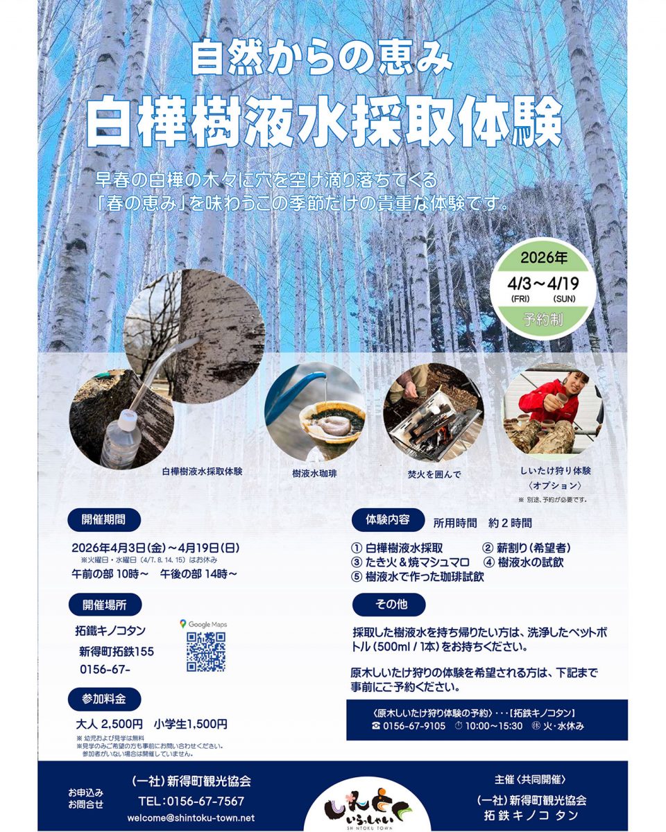 昨年大好評だった、白樺の木から流れ出る“春の息吹”を直接味わえる貴重な体験「白樺樹液水 採取体験」が今年も開催されます。