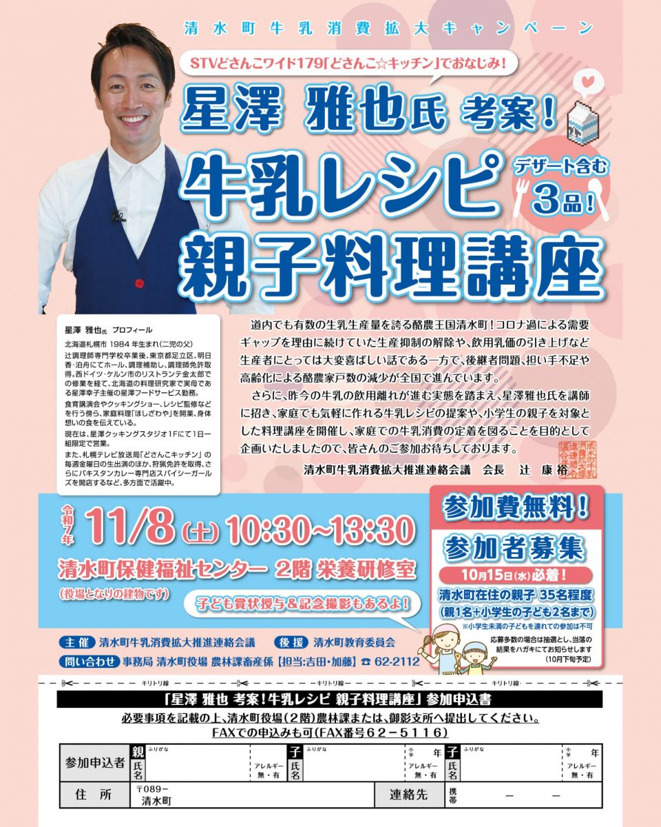STVどさんこワイド179「どさんこ☆キッチン」でおなじみの星澤雅也氏による牛乳レシピ親子料理講座の参加者を募集中です!清水町にお住まいの親子の方(親1名+小学生の子ども2名まで)が対象です。