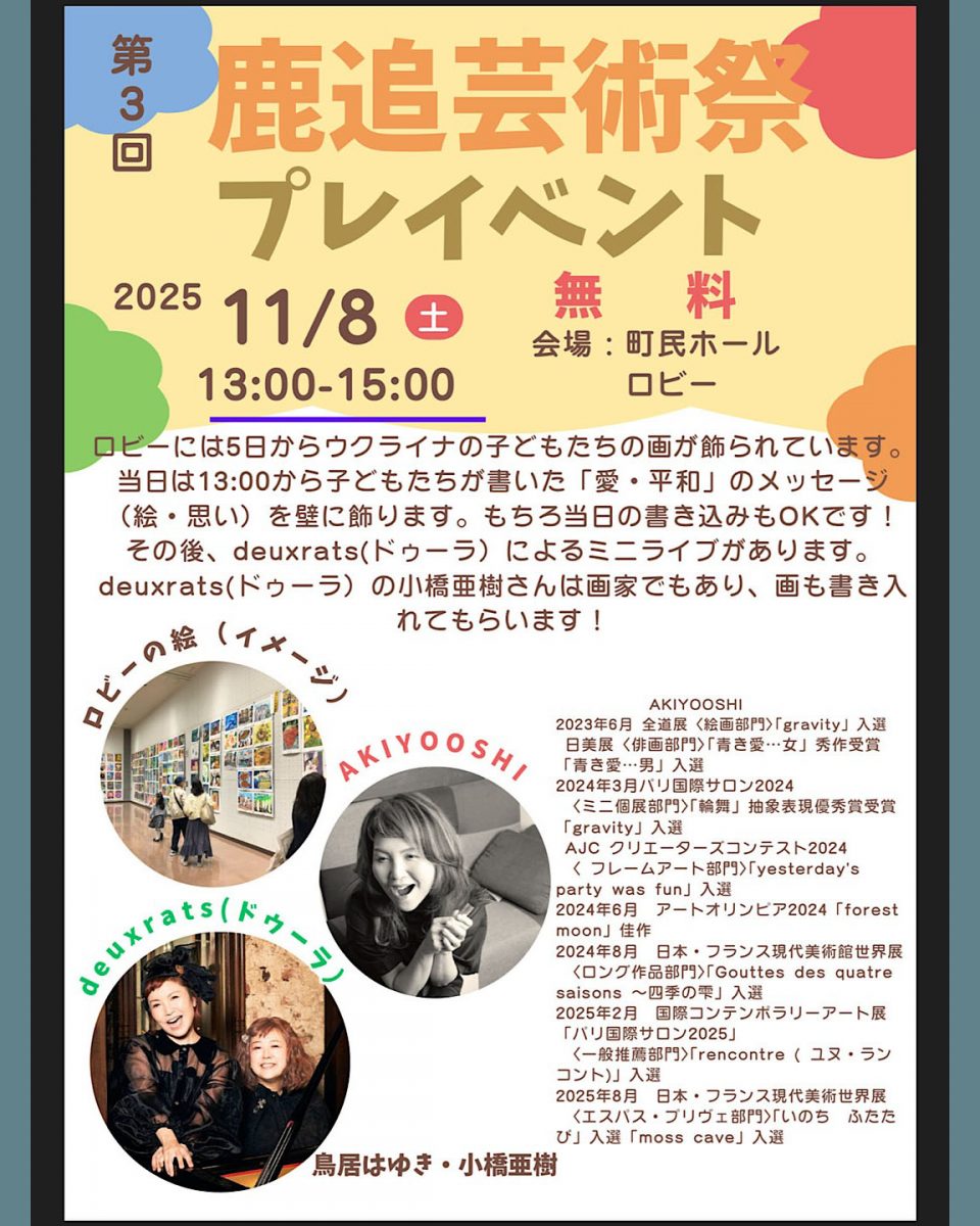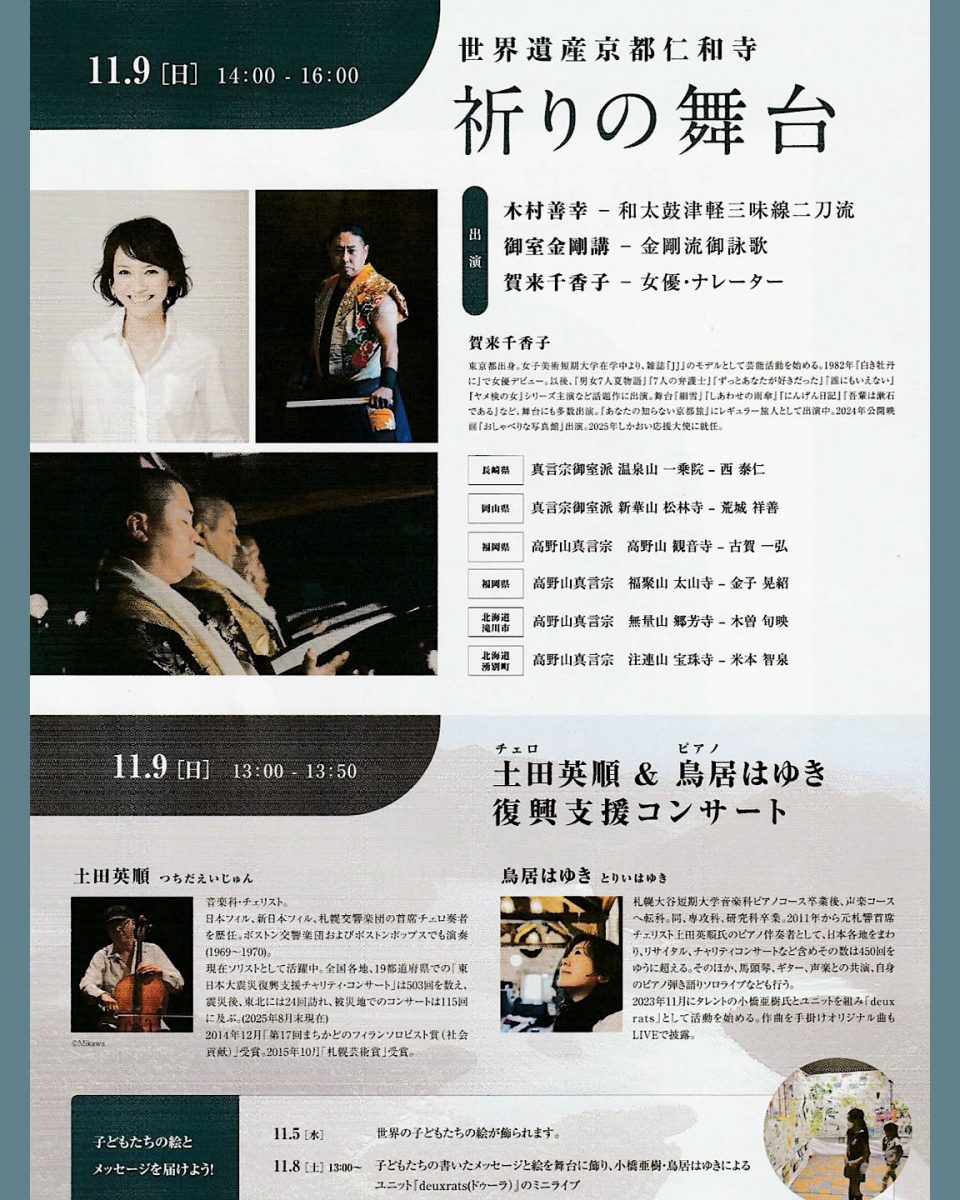 また同日は13時から復興支援コンサートが開催されるほか、前日の11月8日にはプレイベントとして子どもたちの絵とメッセージ展示、ミニライブが開催されます。