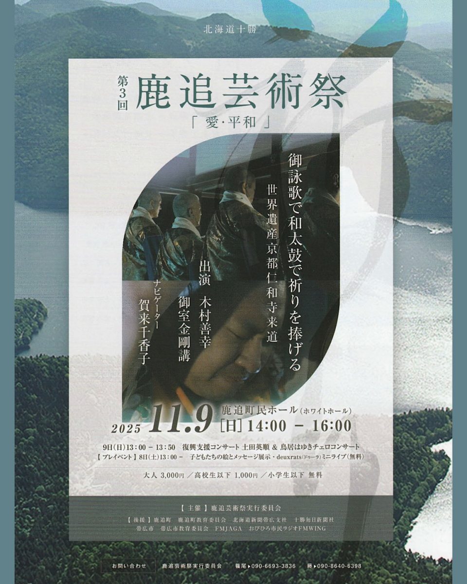 ナビゲーターにしかおい応援大使の賀来千香子さん、出演は同じくしかおい応援大使の木村善幸さんの第3回鹿追芸術祭「愛・平和」が11月9日に開催されます。