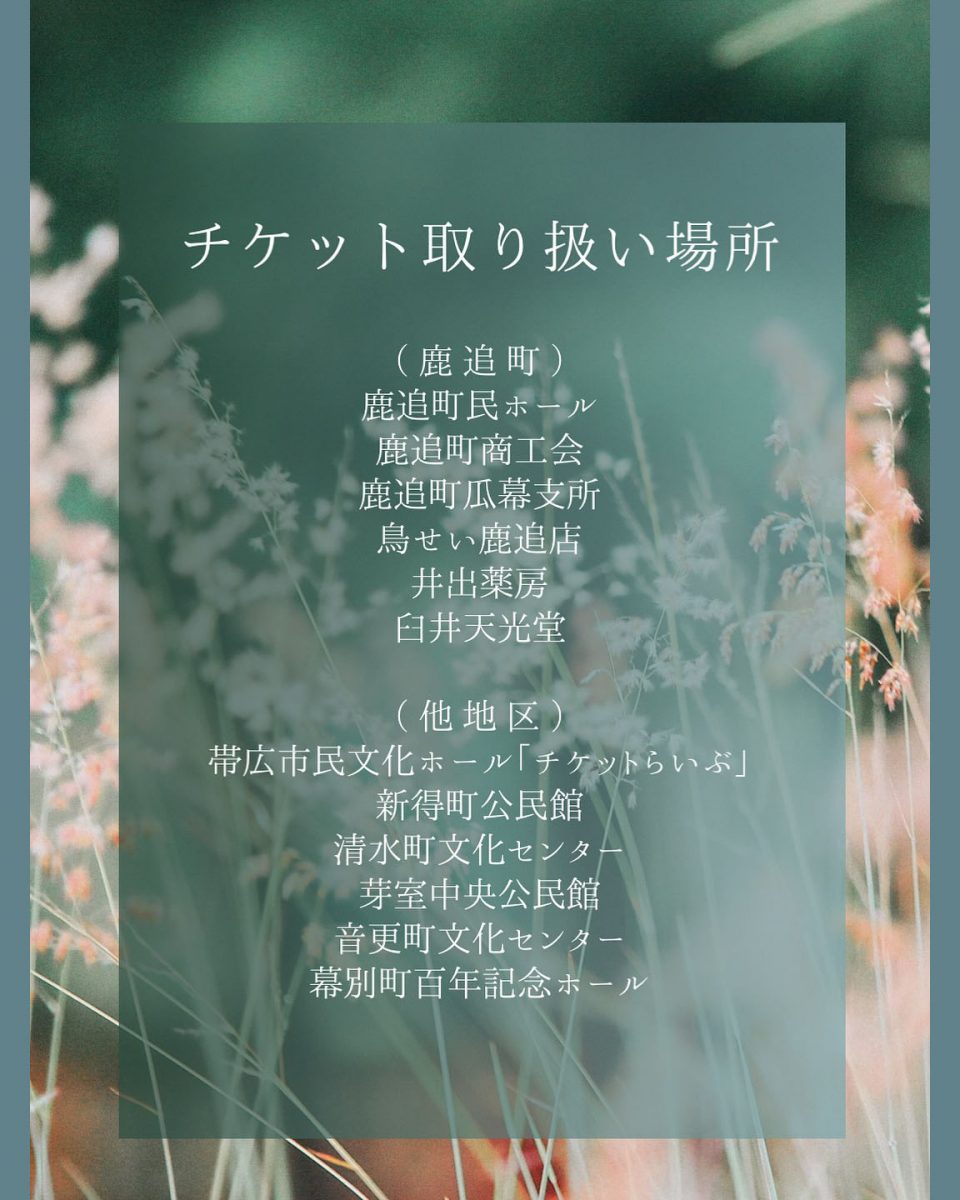 チケットは鹿追町民ホールほか、帯広市民文化ホール、近隣町村の公民館・文化センター等で販売しています。