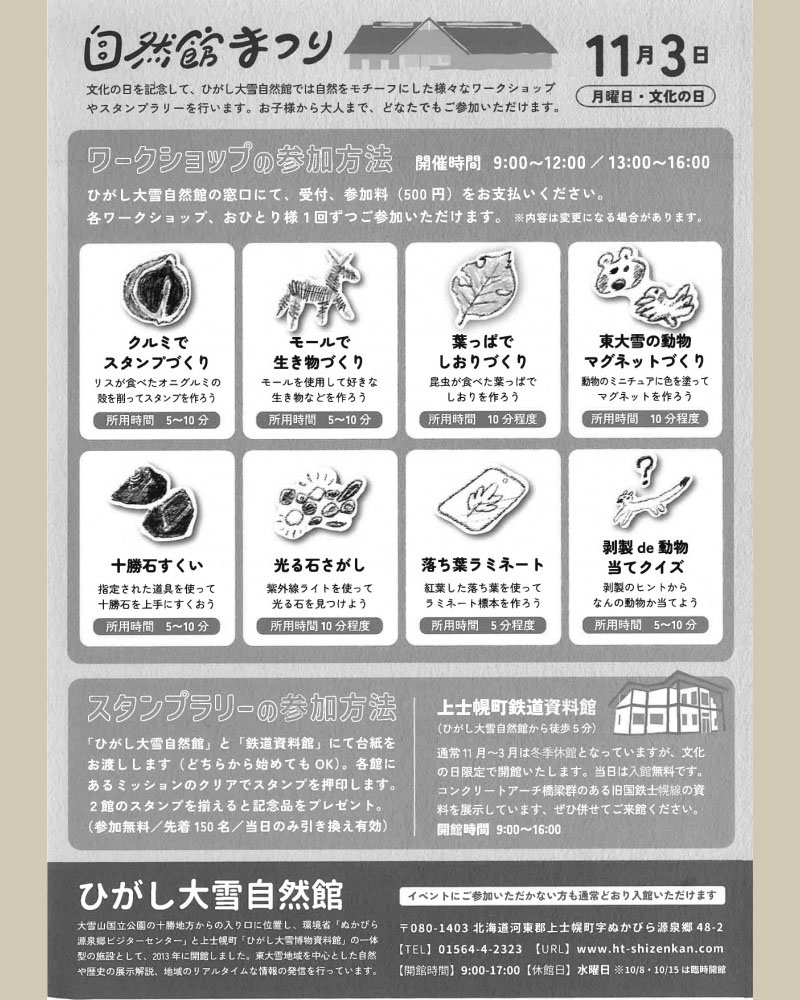 11月3日(月・祝)の「文化の日」、ひがし大雪自然館で「自然館まつり」が開催されます。自然をテーマにした楽しいワークショップやスタンプラリーが行われ、お子さまから大人まで、どなたでも気軽にご参加いただけます。