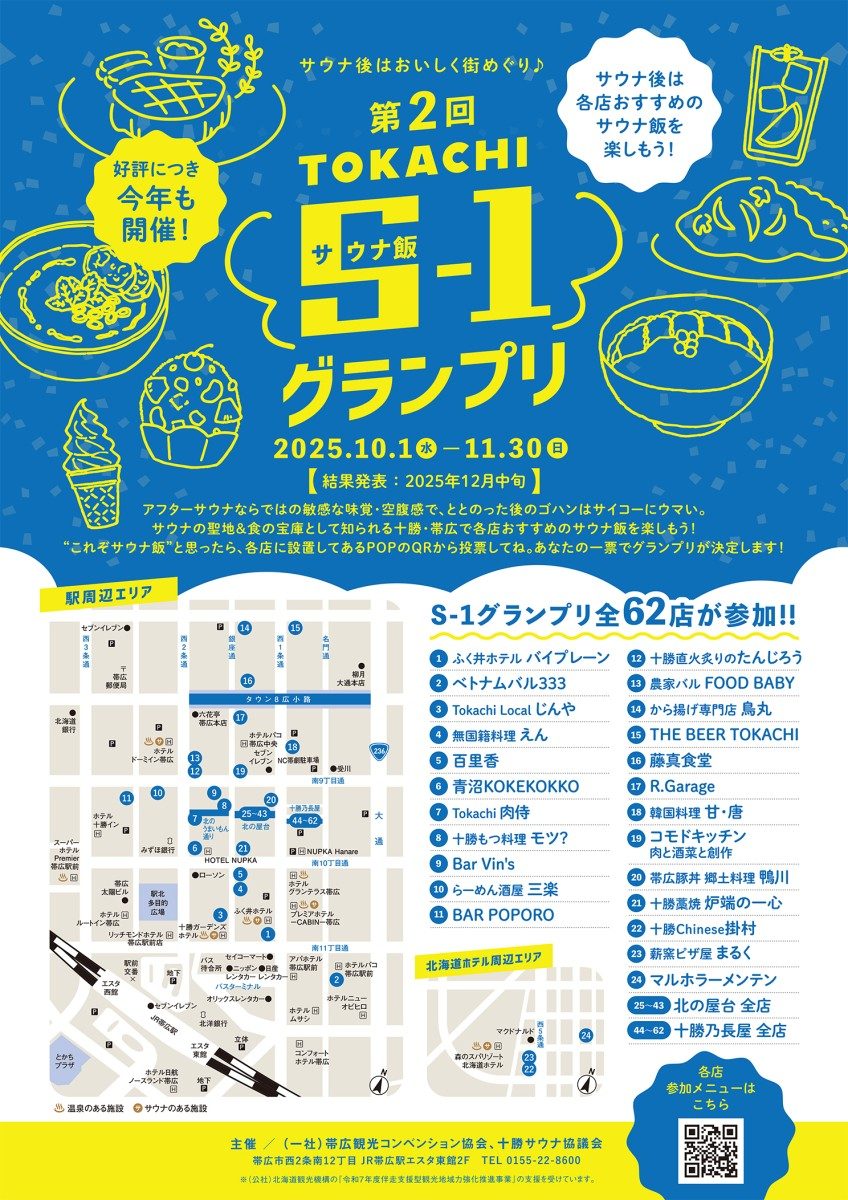 2025年11月21日 / 最終更新日 : 2025年11月21日 toyo-admin トカプチ雄大空間 第2回 TOKACHI S-1グランプリ 帯広市内のまちなかで開催されている「十勝サウナ飯グランプリ」。 サウナの聖地&食の宝庫として知られるこのまちで、各店おすすめのサウナ飯はいかがですか? 応募は参加全62店舗に設置してあるPOPの2次元コードから投票できます。 期間は11月30日(日)まで。 アフターサウナならではの敏感な味覚と空腹感で、ととのったあとのご飯を食べてぜひ投票を! 第2回 TOKACHI S-1グランプリ 期間/11月30日(日)まで(結果発表:12月中旬)