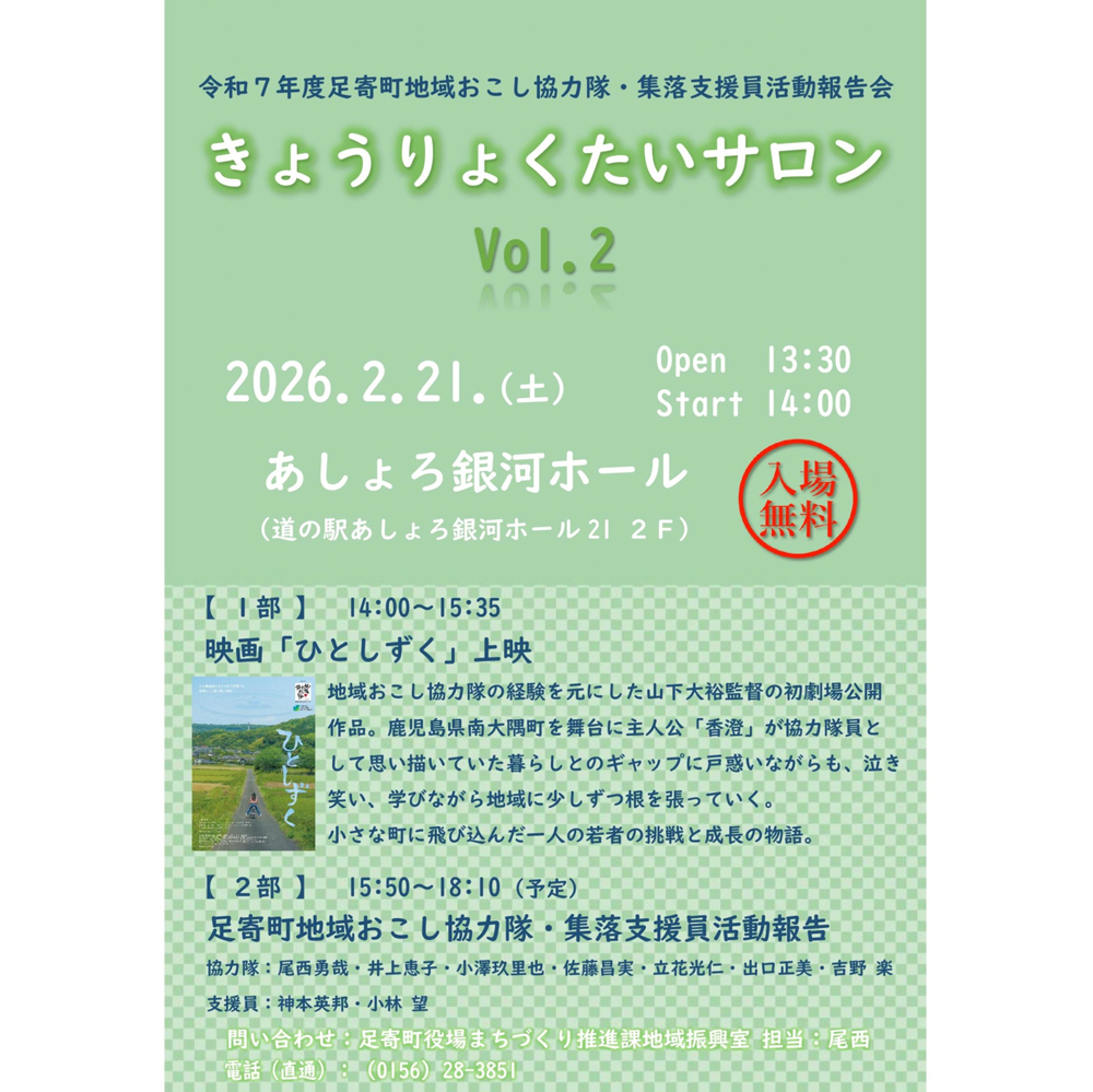 令和7年度足寄町地域おこし協力隊・集落支援員活動報告会「きょうりょくたいサロンVol.2」が開催されます。